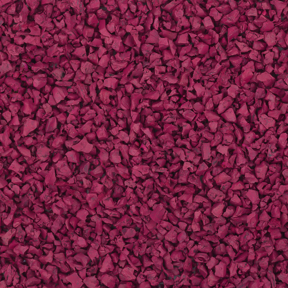 SBR-крошка пурпурного цвета — это бутадиен-стирольный каучук, один из самых популярных и доступных по стоимости материалов, получаемых путем переработки. Он создается из недорогих источников — использованных покрышек легковых и грузовых автомобилей. SBR-крошка используется для обустройства пешеходных дорожек и зон, игровых и спортивных площадок, находит применение в различных ландшафтных проектах. Срок службы такого покрытия составляет 10-15 лет и более.