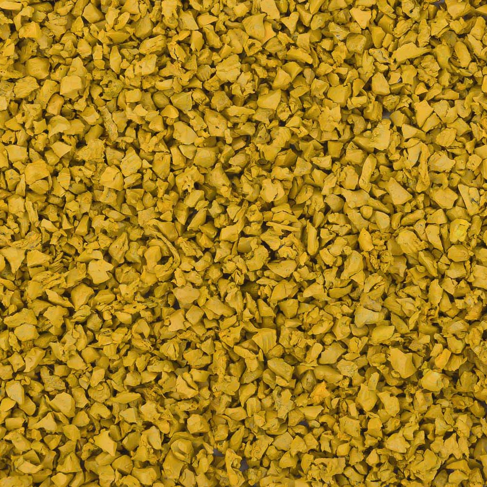 SBR-крошка цвета теплый желтый — это переработанный продукт, который изготавливается простым способом из недорогих материалов, таких как старые легковые и грузовые шины. По стоимости она является одним из наиболее доступных полимерных составов на основе каучука. Область применения крошки широка: создание пешеходных зон, игровых и спортивных площадок, ее используют в ландшафтном дизайне. Продолжительность службы такого покрытия составляет около 10-15 лет.